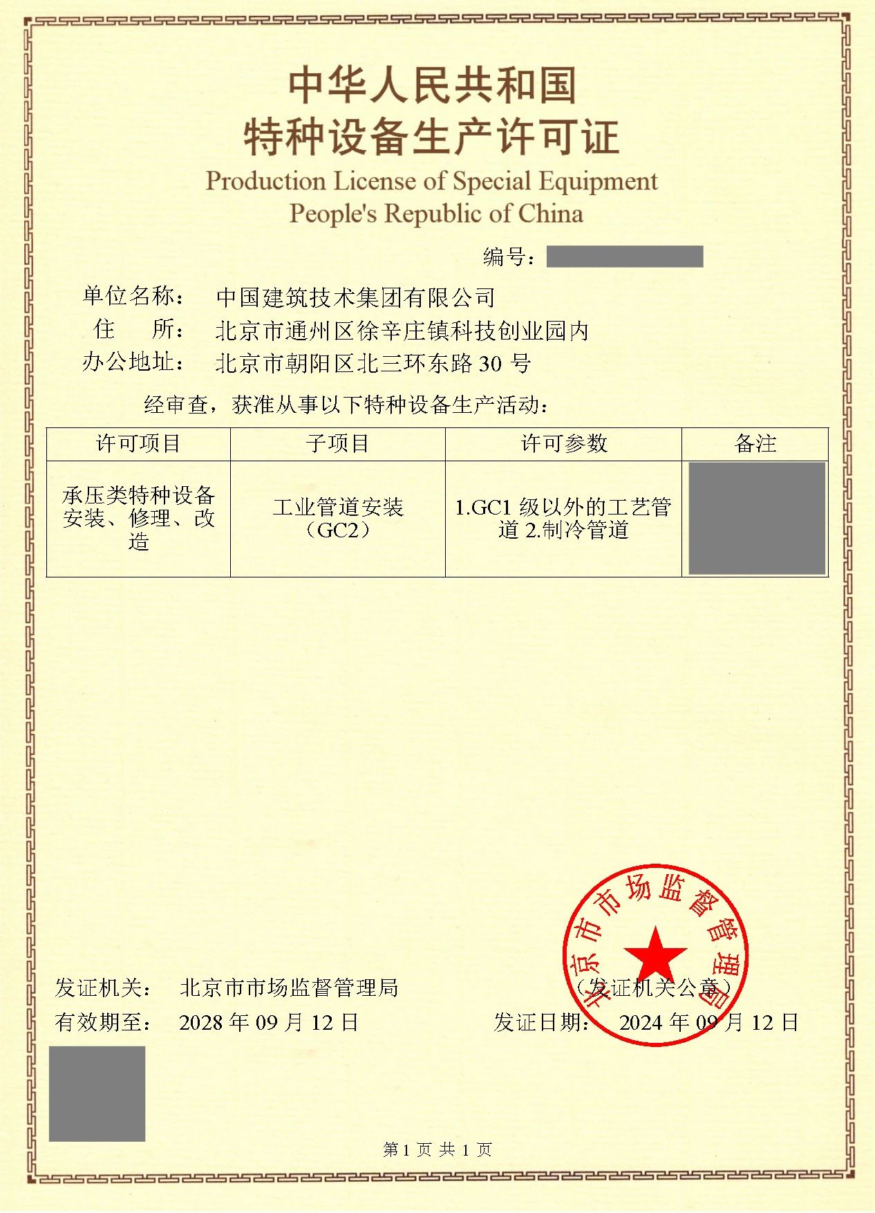 9月12日,经北京市市场监督管理局审核通过,9428cn太阳集团古天乐成功取得“特种设备(GC2级工业管道安装)生产许可证”。工业管道安装(GC2级)生产许可证主要适用于承压类特种设备的安装、修理和改造。