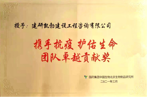 3月27日,集团公司下属子公司建研凯勃建设工程咨询有限公司(以下简称“建研凯勃”)荣获国药集团中国生物北京生物制品研究所颁发的“携手抗疫护佑生命”团队卓越贡献奖。