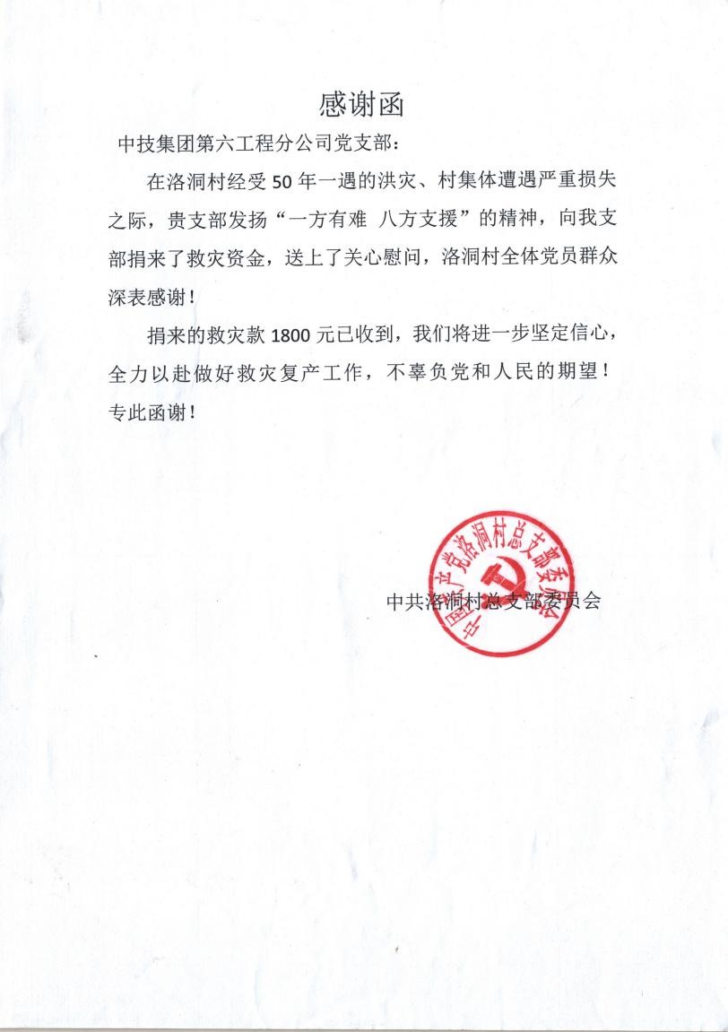 灾区党委及政府为感谢我司及六分党支部在灾情中的巨大贡献特致感谢信,高度赞许我们“用行动肩负起使命担当”,表达了对我司“一方有难,八方支援”帮助受灾的汤塘同胞度过难关的感激情怀,同时对我司和六分党支部组织的“情系汤塘,抢险救灾,爱心捐赠”活动以及为灾区所捐的物资和款项表示由衷的感谢!