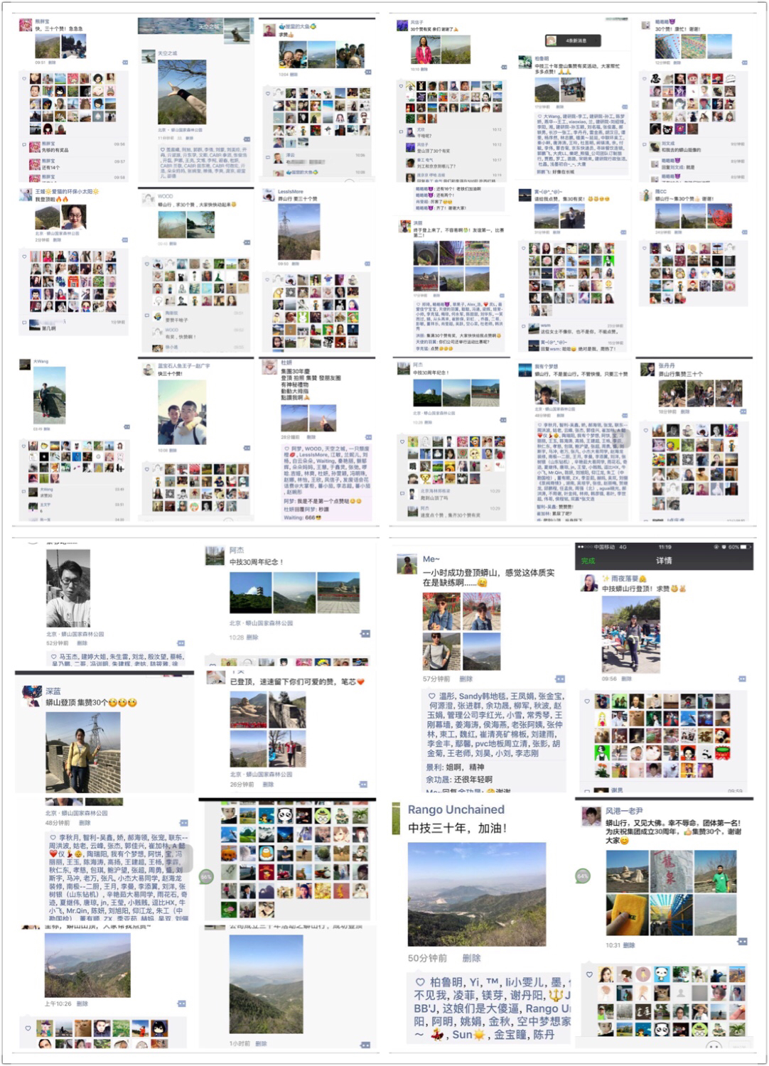 春季登山比赛早已作为中技集团工会一年一届的经典活动,在这次活动中,主办方为配合公司成立三十周年加入了一个创新的小游戏,即登顶前三十人发朋友圈集齐30个赞后有一份神秘奬。