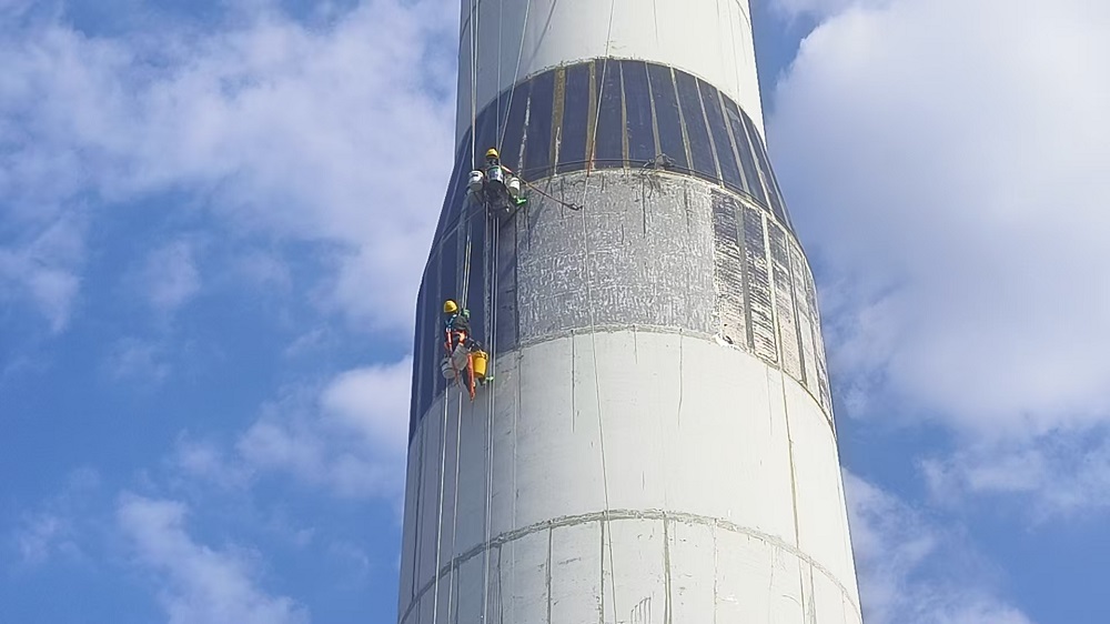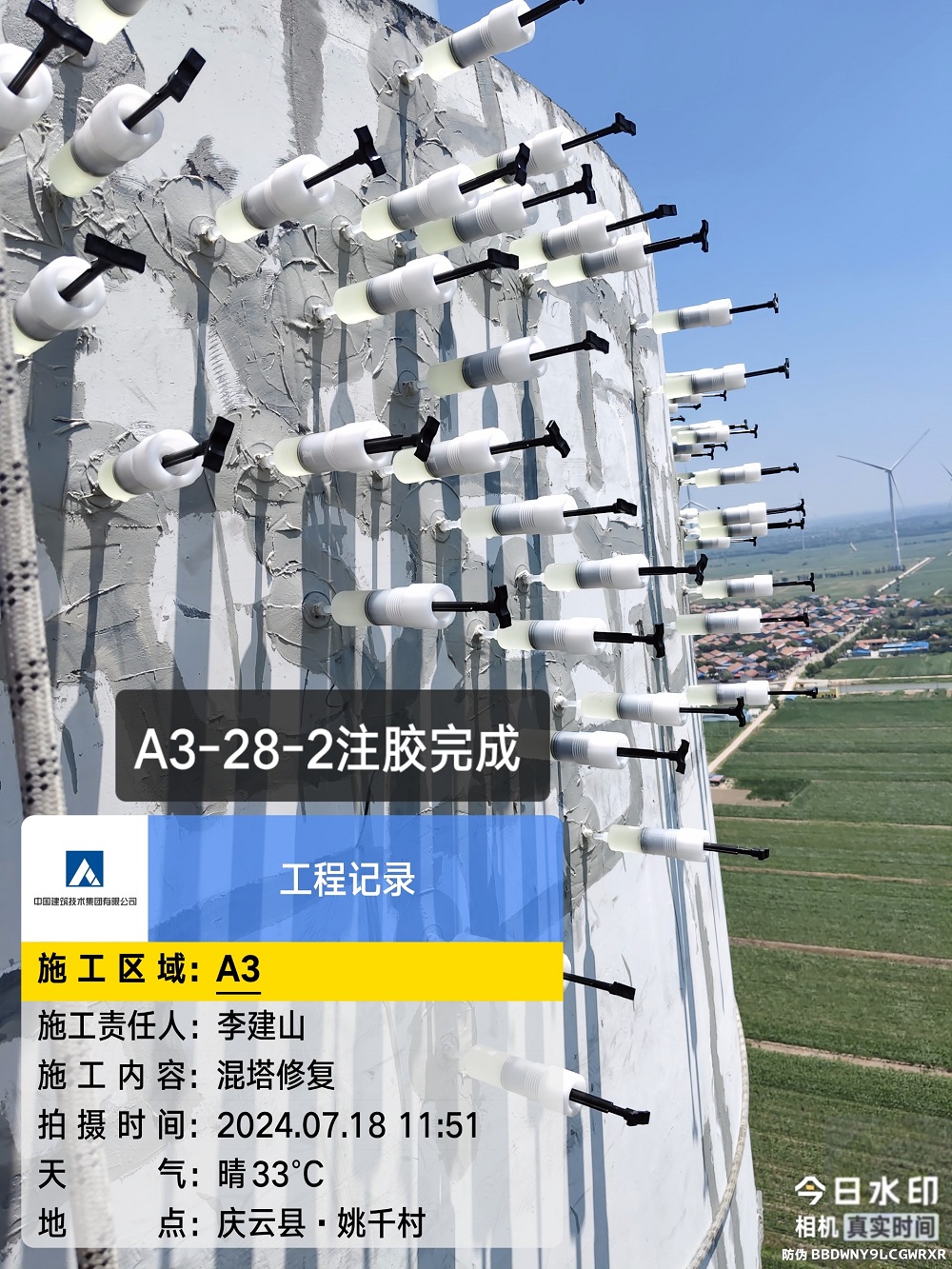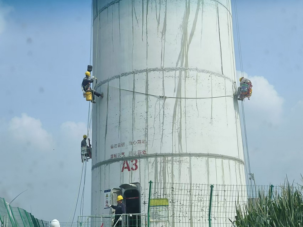 山东省德州市的中广核庆云尚堂风电场位于山东省德州市庆云县尚堂镇。WD195-5000型风电机组,混凝土部分为预制装配式结构,混塔总高110.03m,共28层。M01~M26高3.99m,M27高3.60m,M28高2.4m。M01~M07外径7800mm,M09~M14外径6600mm,M16~M28外径5400mm,M08、M15为过度节段。除门洞位置外,M01管片壁厚为300mm,M02~M27管片底部壁厚300mm,M28管片底部壁厚1050mm。M01~M15各由两个C型管片组成,通过竖缝插筋连接并灌浆,组成完整O型管片。管片M16~M28为完整的预制O型管片。我单位需对塔筒节间缝隙重新补胶,并对个别塔进行空鼓、掉块及裂缝进行修复。