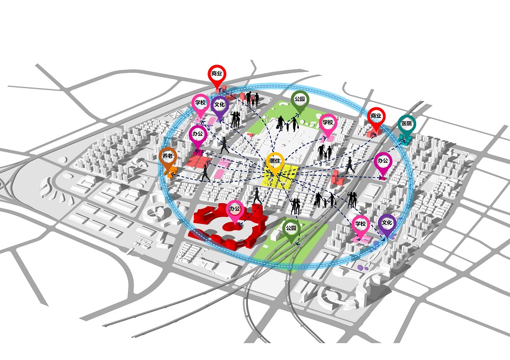 根据基地居民配套需求和出行半径,嵌入式配套生活设施,满足项目地块规划8万人的居住、医疗、教育、健身、康养、出行等生活需求,引领城西片区居民由工厂式的生活方式往城市休闲的品质转变。