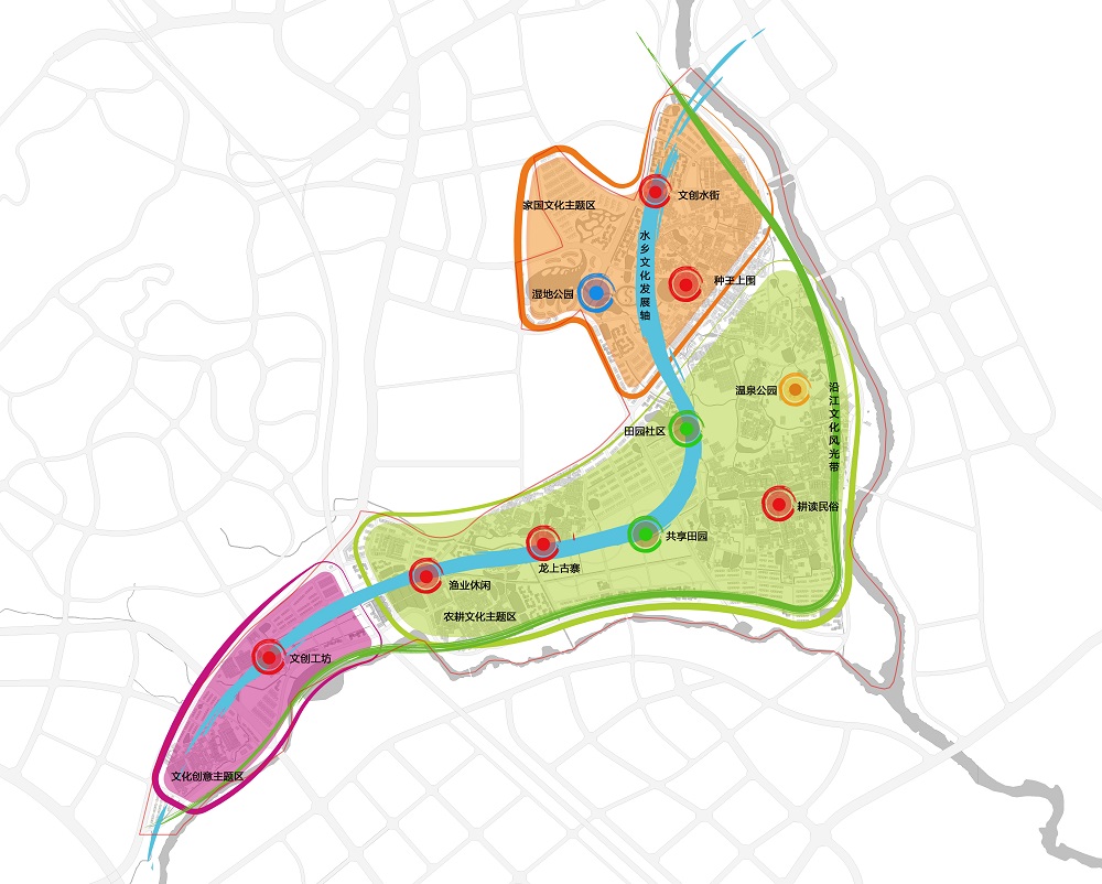 依托丰顺本土如纸花、丰顺石、红陶等文化遗产,打造020水乡特色线下品牌体验店,形成文创工艺店、艺术博物馆、水上集市、水岸公园等核心文创业态;同时,以温泉品质住宿、特色餐饮为支撑,创造活力的、色彩斑斓的亲水开放空间。