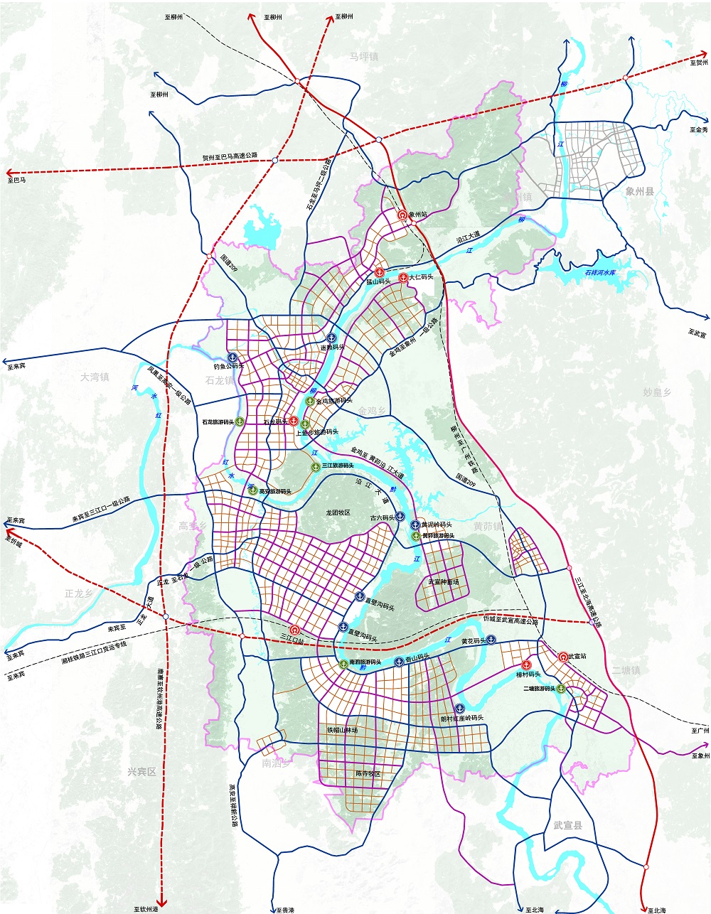 高效综合交通系统规划——以区域性交通互联互通为突破点,形成以港口、铁路、公路为核心的多式联运对外综合交通体系,强化以港口码头为中心建设通往柳州、河池等周边城市以及通往粤港澳大湾区城市的黄金水道;重点推进三江口新区产业组团与国道209、国道355等区域性交通干道的衔接;完善以港区港口为支点的港产城融合发展体系:加快石龙码头、直壁沟码头、黄泥岭码头及其配套设施的建设,以港口为依托,完善集疏运体系,促进港口与腹地经济良性循环发展,驱动新区从“码头经济”走向港产城融合发展。