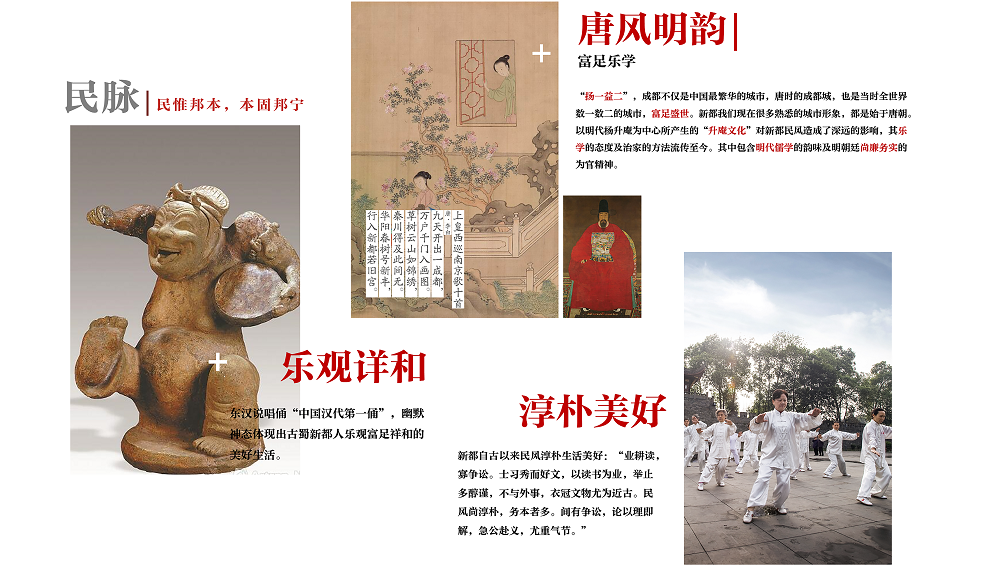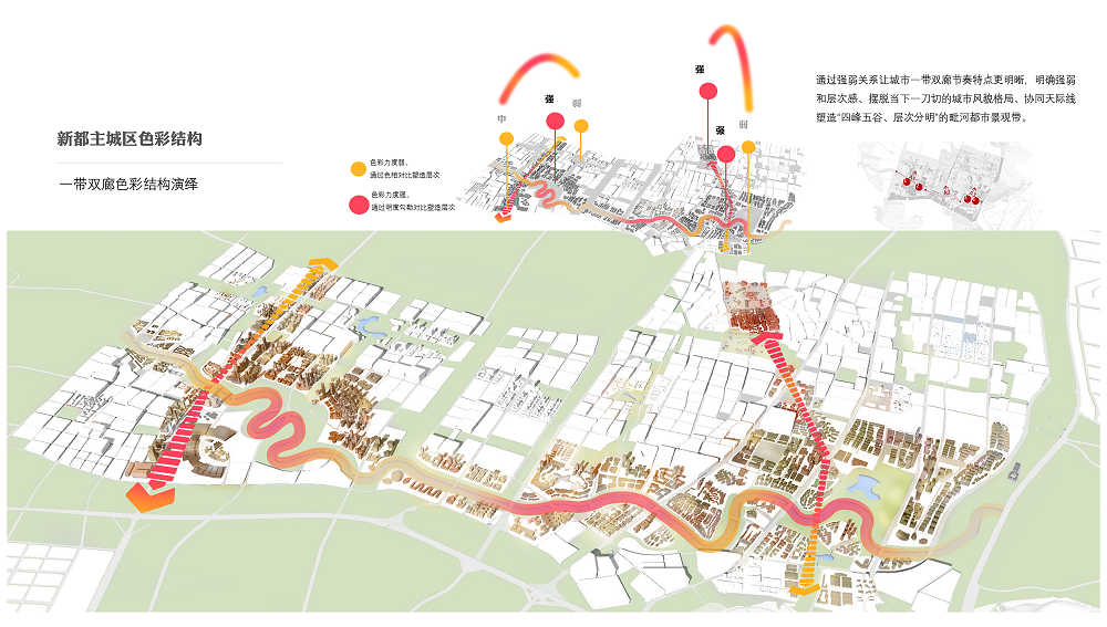 新都区城市容貌提升,是在公园城市建设背景下,追溯城市文脉、梳理城市色彩基底、寻找城市主调,以城市色彩为核心,开展的系统性城市形象识别系统提升。创新执行的城市色彩、户外外摆、户外广告、户外导视系统,将城市以点、线、面的方式,全系统覆盖,通过综合性的治理体系及样板段示范,建立可实施可落地的管控引导。