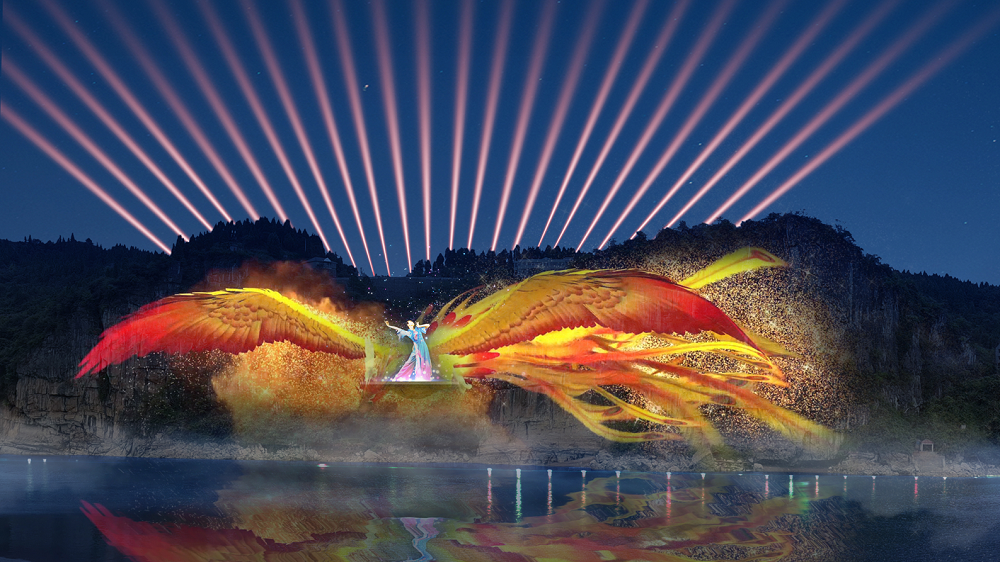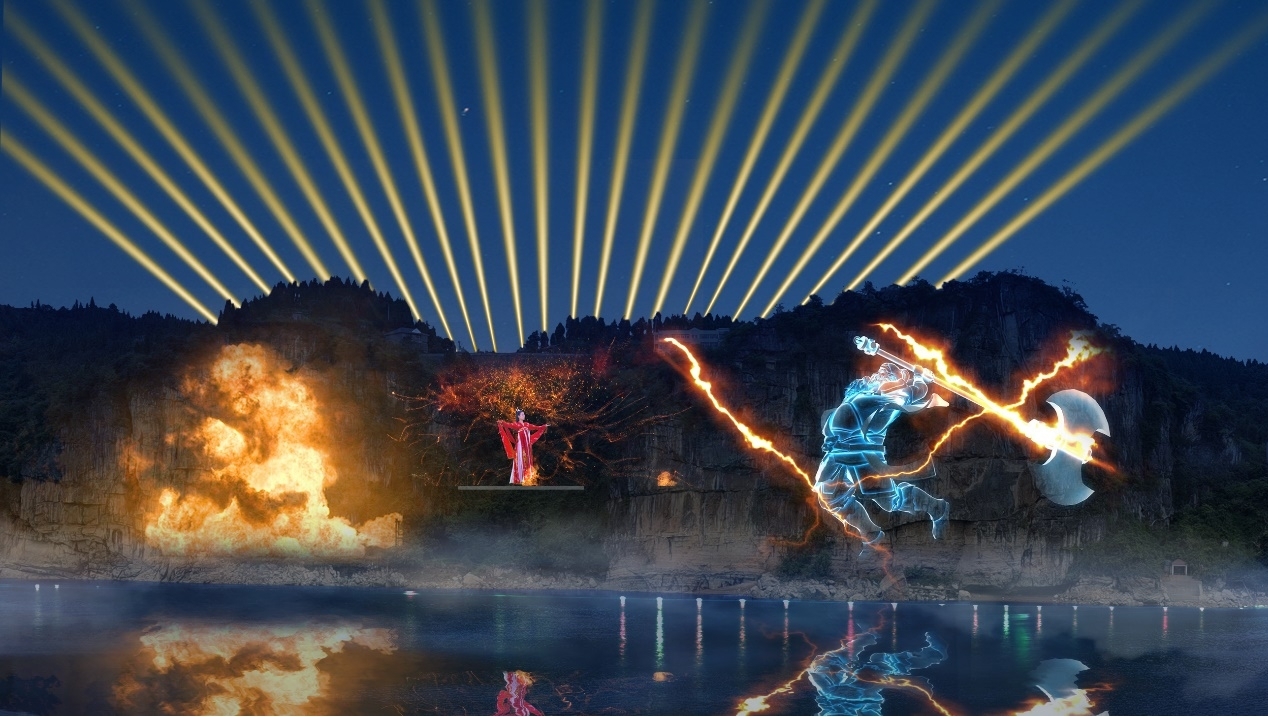 崖壁5D灯光秀尤为新颖,采用“崖壁投影+舞台演绎”的方式,以两侧崖壁为投影载体,中间布置小舞台配合灯光矩阵,将辛女与盘瓠的凄美爱情故事和妖怪来袭国破山河场面,将军点兵出征的戏剧场面演绎得活灵活现。