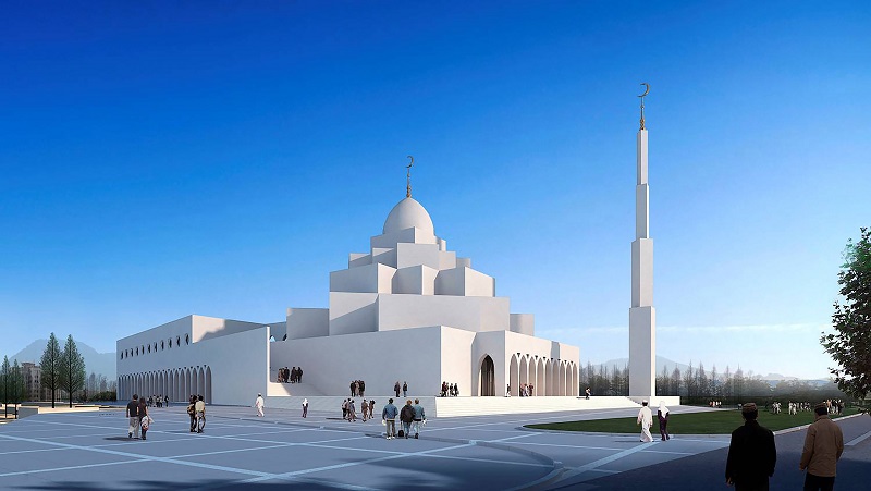 根据伊斯兰教义和传统,清真寺的要素 【“米哈拉布(凹壁)”、“齐布拉墙”、“礼拜殿”、“庭院”、“环廊”,以及“宣礼塔”】,永远需要朝向麦加方向。在遵循这个传统的同时,承启前面的规划思路后,建筑形体和外部环境,也发生了一些有趣的变化:在建筑的北侧和东侧,分别与环境形成一些缺角;利用这些缺角和地形设置台阶,又可形成多个层级的平台,而每层平台根据需求不同,又可布置各种与空间相适应的建筑功能。(例如,内庭院的主要出入口,就可以与东侧和北侧的地形结合)这种互为逻辑的关联性,正是建筑设计的有趣之处。
