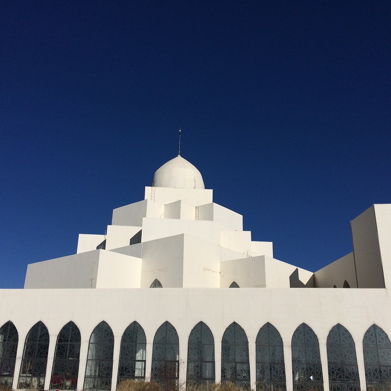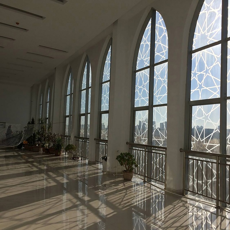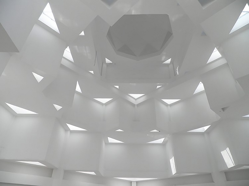 沿西北角三段式大台阶而上,可到达清真寺最重要部分的礼拜殿,也是建筑设计的“点睛”之笔:礼拜殿和穹顶的设计,运用了同构原理,将伊斯兰纹样进行分解、变化后,生成新的几何形体,每一层退台与建筑形体旋转相结合,产生更多、更丰富的三角形平面组合,利用这些组合,为礼拜殿上空设计了“逐层退台”的三角形采光窗。给礼拜殿带来了丰富的自然光源。同时,一天内的光束变化,也将人引向一个深邃的、神圣的、崇高的精神空间。