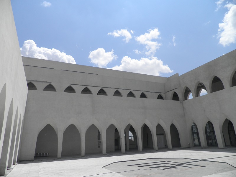 与礼拜殿相连的双层环廊设计,通过一系列的拱形门柱,将庭院紧密环抱。门柱的拱形在延续13-15世纪建筑风格的基础上,又加以了创新,门拱如扭曲的柳叶,形成自然曲面,朝向庭院。洁白的环廊与麻石地面,所构成的机理对比,给人以庄严、朴实的印象。37m高的宣礼塔同样采用运用了同构原理,将钢结构三棱柱体以几何关系层层递减,塔顶的宝瓶和月牙形装饰物,与礼拜殿穹顶上的标志遥相呼应,构成伊斯兰教"弯月涵星"象征。