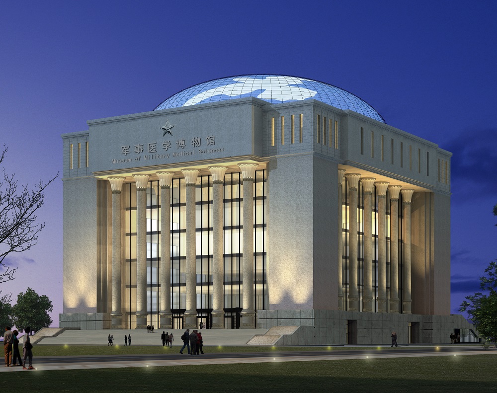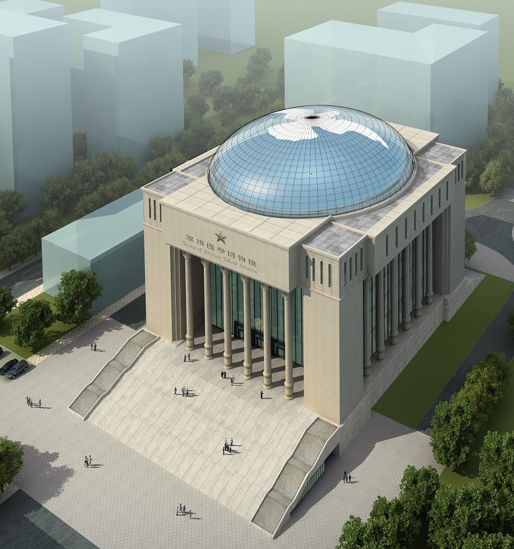 中国人民解放军军事医学博物馆位于北京市海淀区太平路,军事医学研究院内西南角,是一座国家级大型军事医学类博物馆。建筑用地0.873公顷,总建筑面积38000平方米。主体建筑方正,顶部圆形玻璃穹顶直径47米,表达了天圆地方的中国文化理念。穹顶玻璃幕结合太阳能技术,部分太阳能反射板组成和平鸽图案,寓意世界和平,表达了设计的主题。