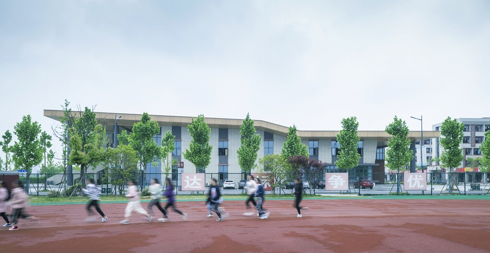 空间规划上,打造以场地水系的改造为基础、贯穿场地东西的创新轴,与主入口和湖面自然串联的南北轴线传承轴。建筑设计突破传统教学楼与地面的简单垂直空间关系,利用柱廊、下沉、屋顶平台等手法,让立体的校园空间具有了流动性和交流性,最大化丰富了学生的交流活动空间。