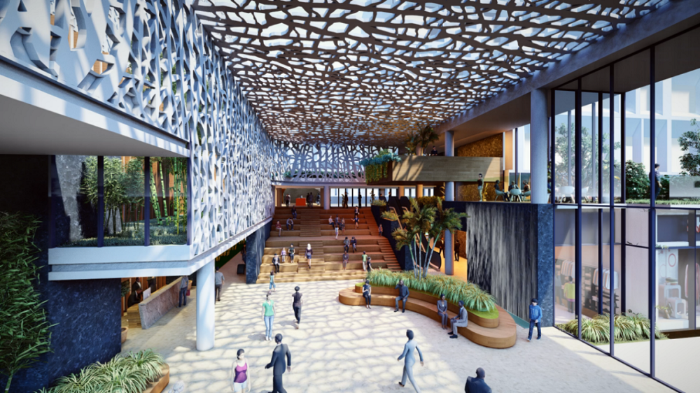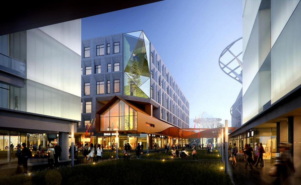 针对项目的所处区域环境、既有建筑群空间与土建现状等现实挑战,规划设计提出打造集住宿、工作、社交、休闲于一体的商务生态闭环策略。通过连通首层商业东线、塑造小镇中心、加建空中连廊、改建局部空间等方式,将首层商业社区、二层酒店社区与上层商务办公社区多业态由平面复合街区转向为立体复合街区,以构建更具温度感的生活情景,加强侵入式的极致体验,提升服务资源的共享品质,创造多样化的空间视点,引发不同视角下对生活的独特感悟。